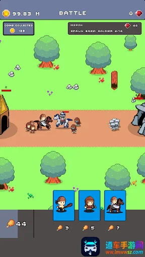 游戏开始后,左下角能不断获得食物来召唤战士战斗,战士击败敌人可获金币。最终目标是击破敌人阵营,过关就能得奖励。回到主界面,还能升级解锁士兵和科技提升战斗力,解锁所有战士后还能进化时代改变战士类型。