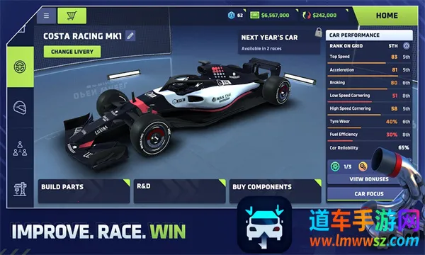 1、打造专属赛车团队:可招募大胆的车手、细致的机械师和全新的工作人员等,亲手挑选杰出车手,打造世界级赛车强国,与车手密切合作,制定主宰比赛的进站策略。