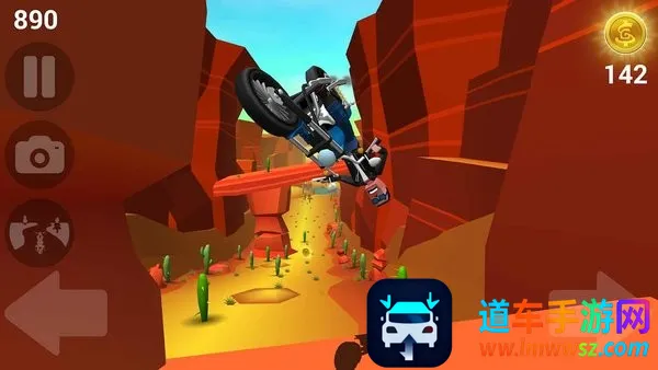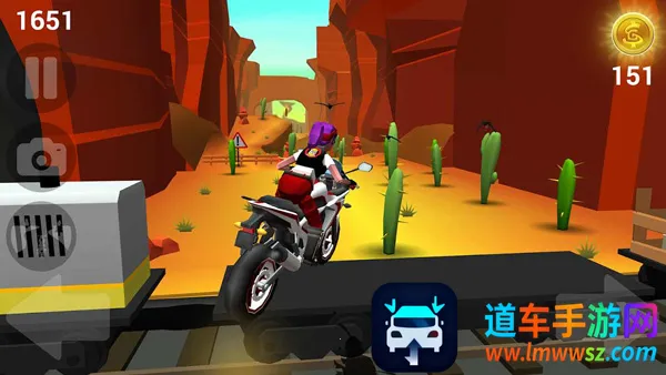 2、玩法刺激:以摩托车竞速为核心玩法,在山峦间穿行,不断避开仙人掌、岩石、车流与火车等危险,体验惊险驾驶旅程。