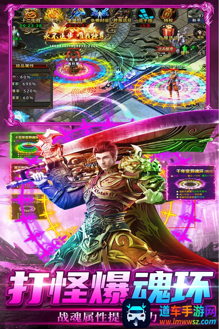 4. 打怪爆魂环,战魂属性提升战力:打怪有几率爆魂环,提升战魂属性,增强自身战力。