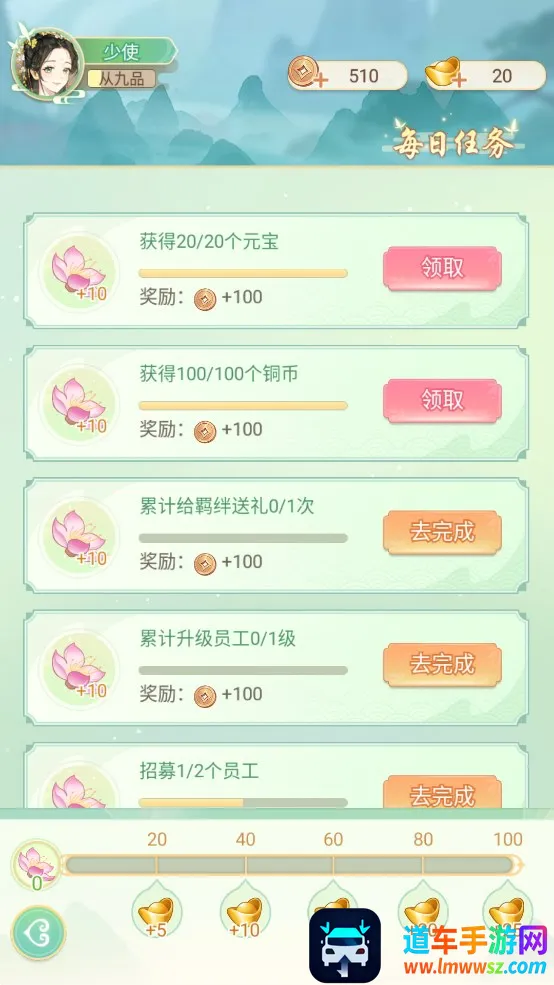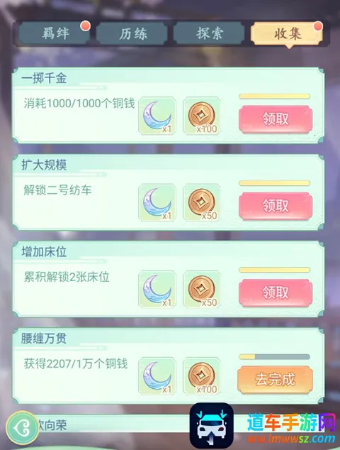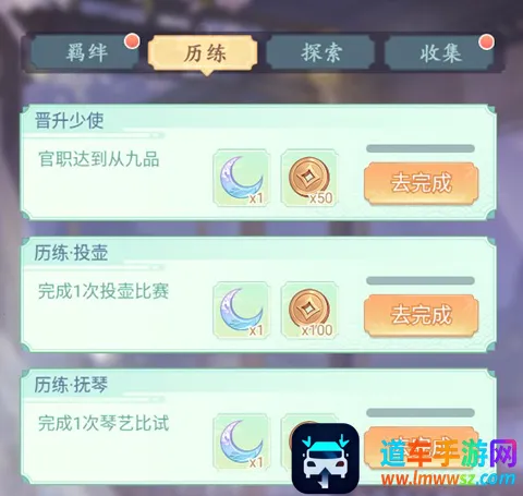 历练成就目前只有官职、投壶、抚琴三个成就任务,完成就可领取成就奖励。