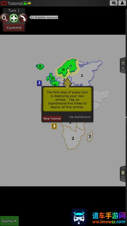 5、每个回合的第一步是部署你的新军队,点击斯堪的纳维亚半岛五次部署所有五支军队。