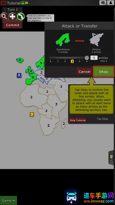 8、点击ok以确认命令并使用所有五支军队进行攻击。当进攻时,你通常想用至少两倍于防守领土的军队进攻。