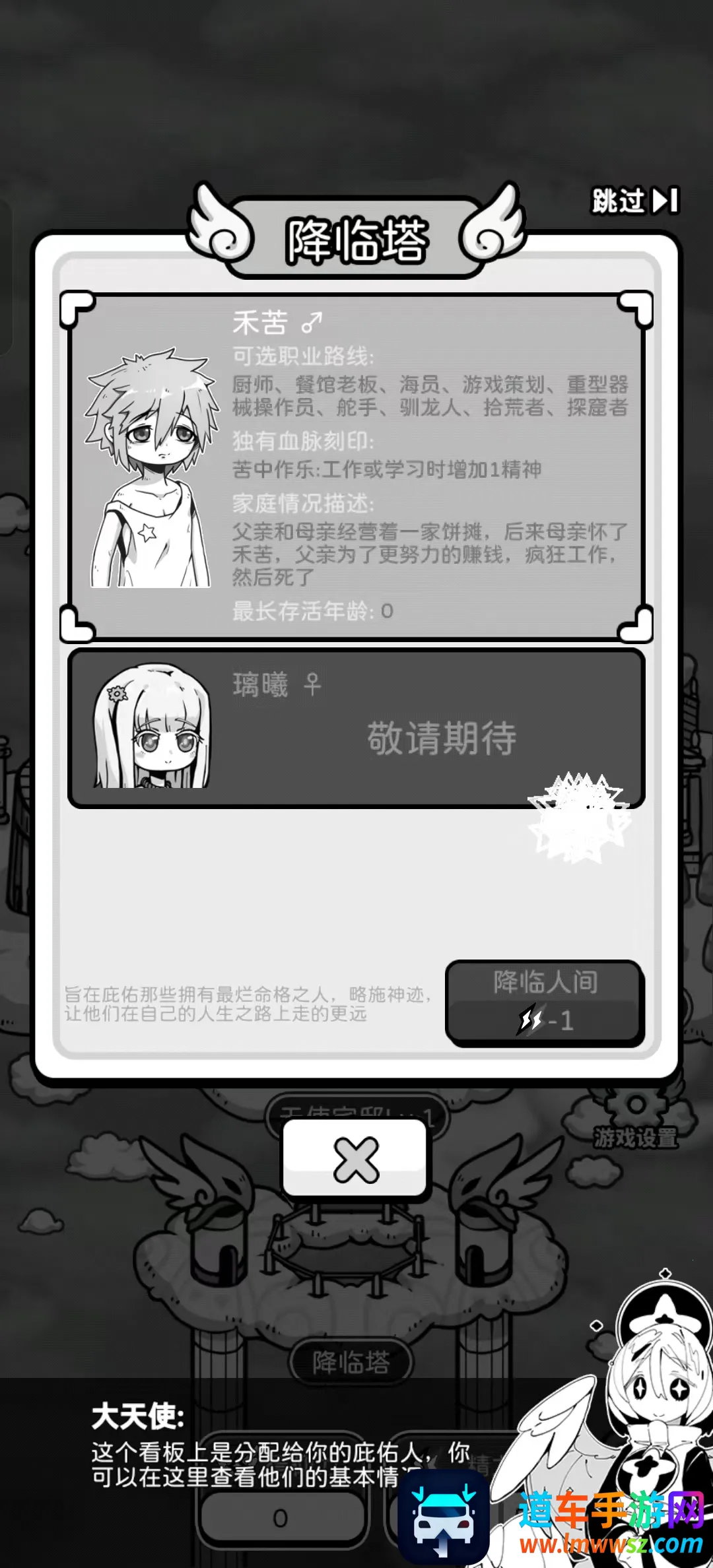 整体而言,游戏画面采用黑白动漫画风,人物形象随年龄变化,玩起来趣味性十足,能让玩家充分体验当天使守护他人命运的独特感受,沉浸在这个充满策略与抉择的游戏世界中。