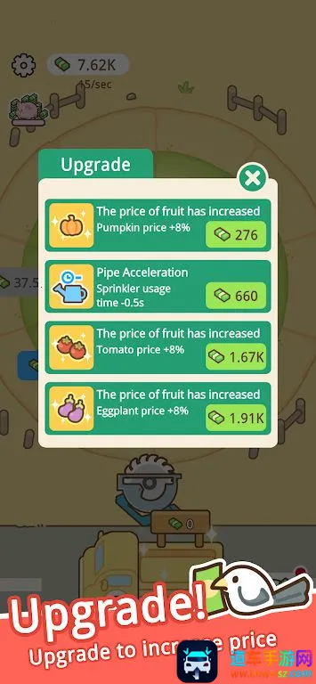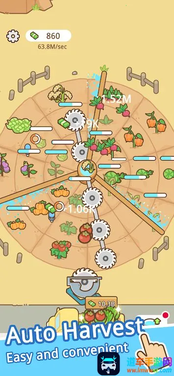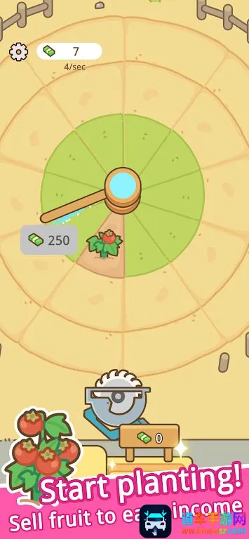 3. 丰富升级体系:通过切成熟农产品赚取金币,可用于升级浇水速度、解锁稀有种子以及实现自动收割,逐步建立起属于自己的终极循环农业帝国。