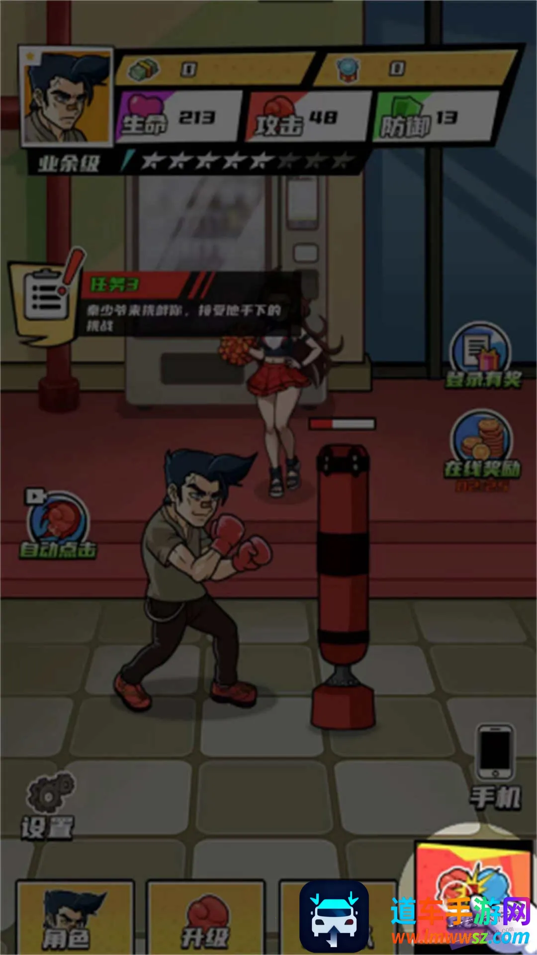拳王的逆袭是一款融合道馆经营与格斗对战的小游戏。玩家扮演主角,从零基础开启拳击逆袭之路。开局剧情老套,按任务提示点击界面即可。被赶出去后经营拳馆,收拾卫生、练拳、查看属性等。