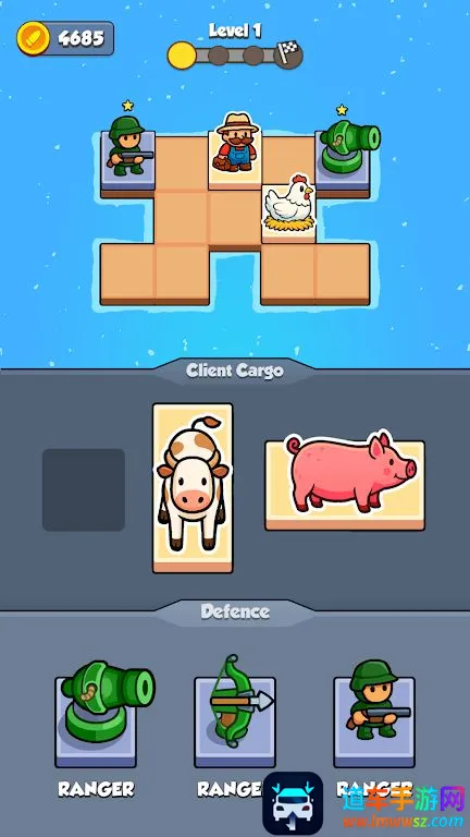 2. 策略性防御:部署防御单位,合并单位强化防御,精心布置防御阵型,抵御一波又一波敌人,保护货物与客户。