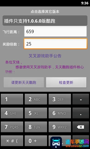 1、手机上面安装好叉叉酷跑助手和天天酷跑游戏, 首先先打开叉叉酷跑助手!会出现如下图界面!!飞行距离填写“3960 。 小编一直使用这个距离,分数还没上传失败过!!如果填写过大,上传分数肯定失败!!3990以上就有点危险了。 然后奖励倍数就填:2 。 然后点击开始游戏按钮!