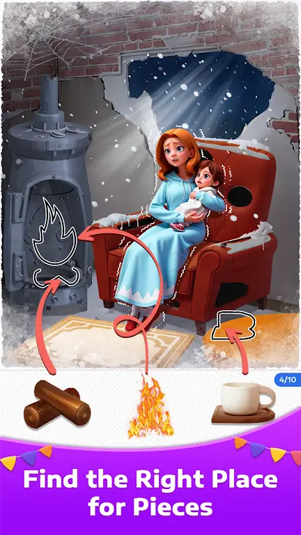 2、简单直观的操作:操作设计简洁明了,玩家只需根据碎片形状和画面线索,将拼图块拖放至合适位置,页面底部显示所需拼图数量,还有实用提示功能。