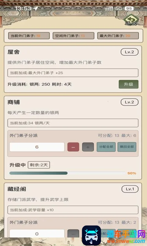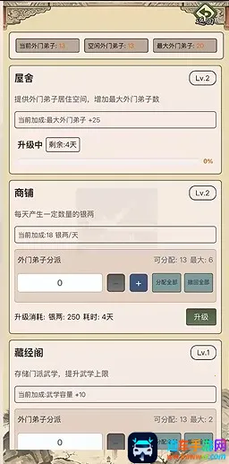 在游戏里,玩家需管理银两流动,合理规划资源与发展方向。招收不同弟子,见证他们修炼提升境界,还能查看详细属性并配备装备、传授绝学。十余种功能各异的建筑等待建造升级,构建完善资源供给体系。