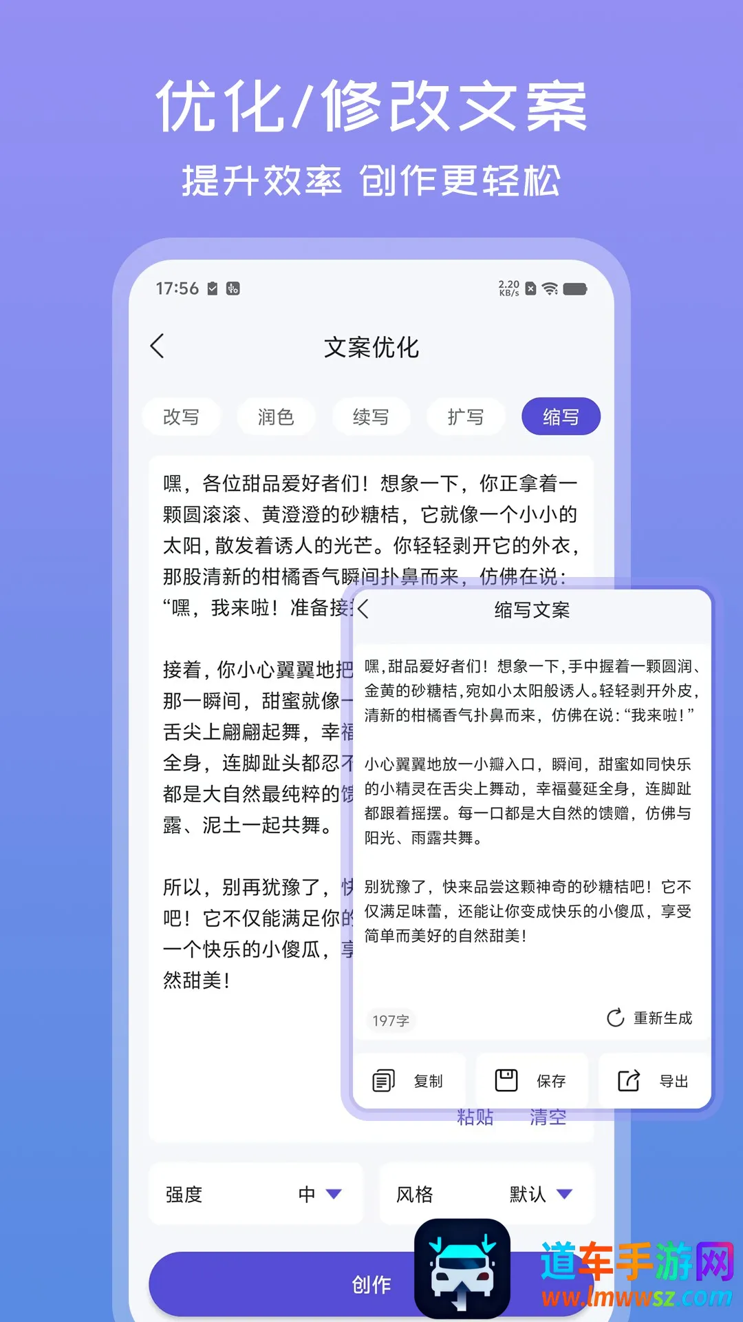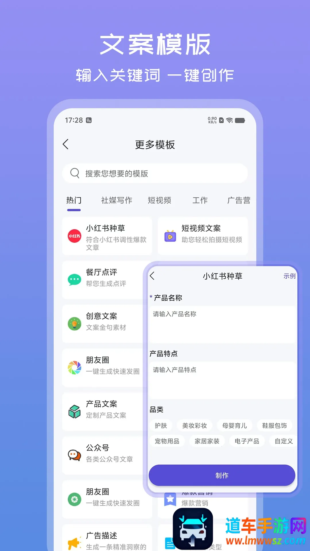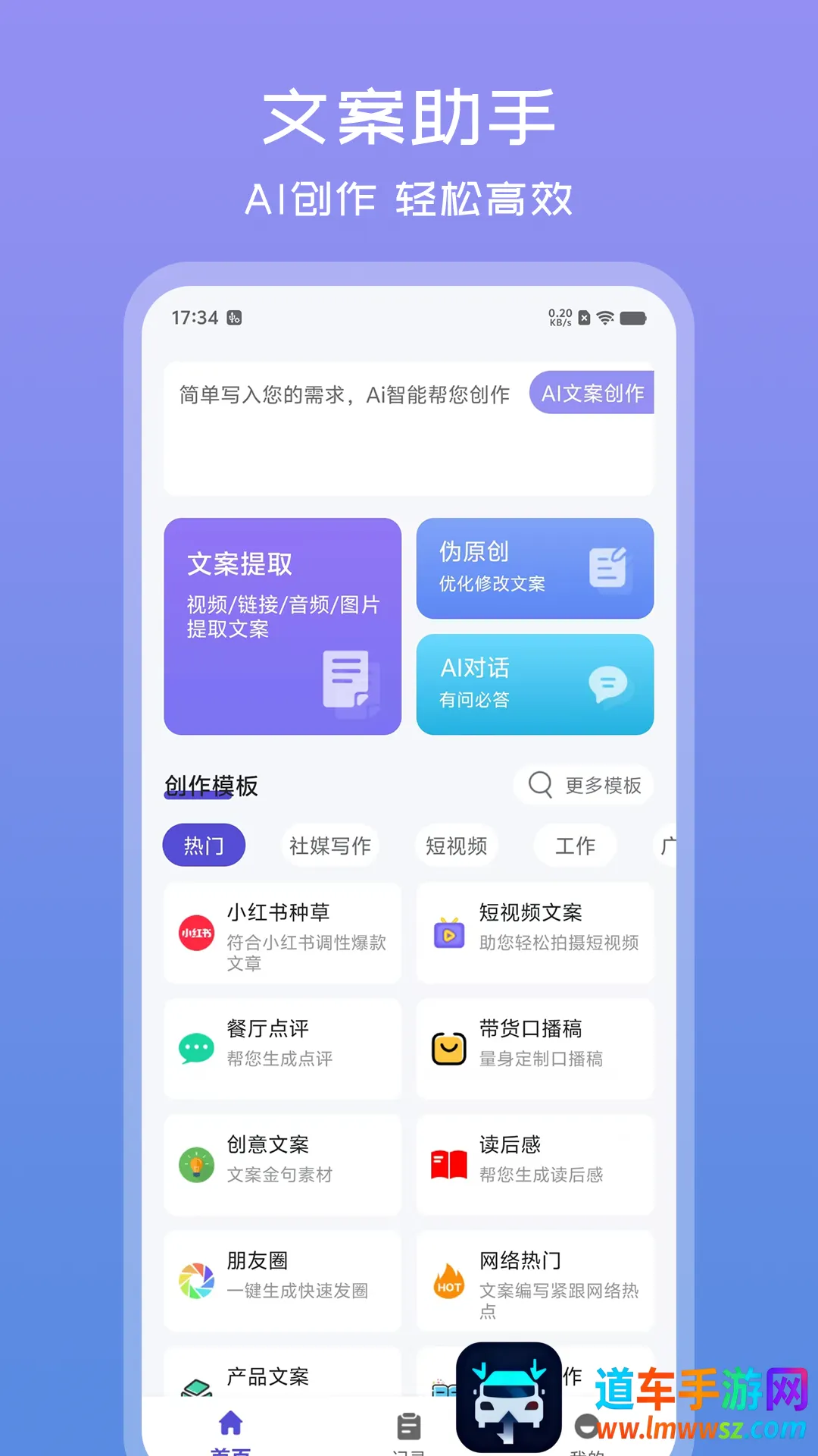 你是否在为撰写文案而烦恼?想轻松制作出吸引人的文案吗?那这款文案助手生成器在线制作软件绝对值得拥有!它集成了智能算法与丰富的文案数据库,输入关键词就能一键自动化生成文章,轻松抓住读者眼球,传递正确信息。软件有大量模板和内容库,即使是初学者也能借助它们创作出优秀文案。它还能依据产品特性等生成个性化精准文案,按质量等要素智能排序找到最优文案。不仅如此,它能提供优化功能,让文案更符合搜索引擎规律,提升吸引力与转化率,还具备自动纠错校对功能,及时发现并纠正文案错误,确保质量。另外,可自定义创建写作模板,一键分享到社交平台高效传播。在本站下载安装打开,首次用可能需注册登录,首页功能多,按需选用就能轻松满足你的文案创作需求啦!