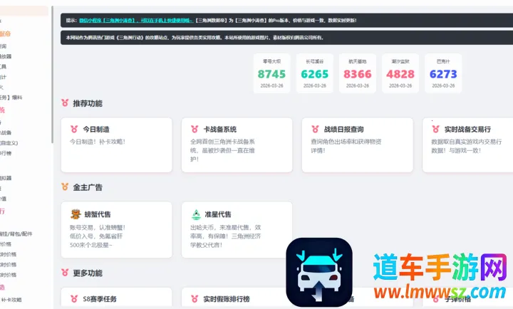 三角洲数据帝工具是腾讯热门游戏三角洲行动的攻略站点,提供实用攻略推荐,有今日制造、补卡攻略,首创且维护卡战备系统,可查战绩日报、角色出场率等,实时战备交易行数据与游戏一致。