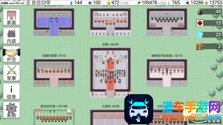 《大出产王国2》是一款像素风经营模拟手游。讲述查乌马帝国遭外敌入侵后,玩家要通过结婚生子、发展建设、征战等方式重振帝国。玩法类似三国志与辐射避难所,有多种特色玩法与难度选择。