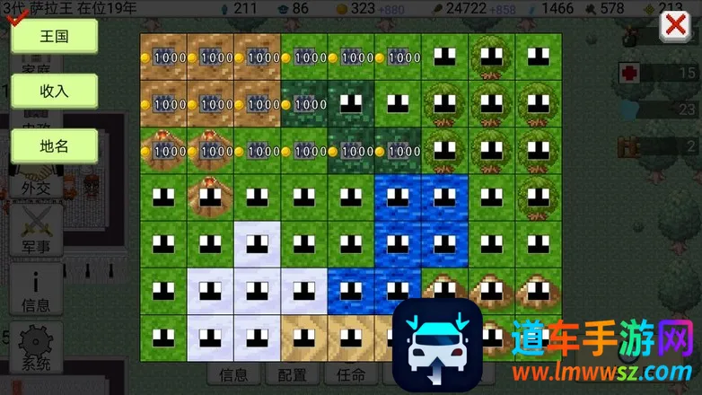 大出产王国2是一款像素风格的策略经营手游。外敌入侵让原本繁荣的王国衰败,作为继承人,你要靠结婚生子,带领后代复兴王国、征服世界。游戏开始先创建新存档,设定角色相关信息。这里有不少门道,比如性别选男前期生育更有利,长短处要选好,储蓄奉献是不错的挣钱方式。