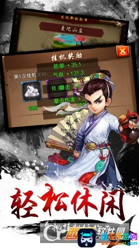 3. 轻松挂机:无需复杂操作和过长在线时长,单机挂机rpg,轻松点击就能实现江湖探索、集结群侠、开宗立派。