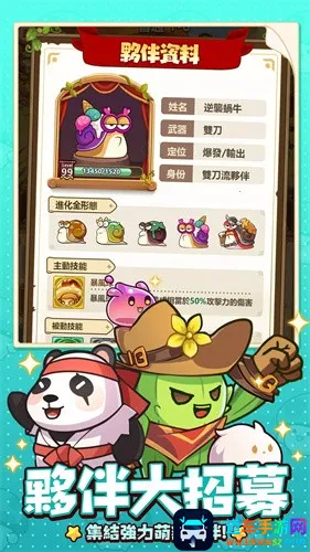 2. 萌宠相伴作战:可选择装备如逆袭蜗牛等宠物,宠物具备主动和被动技能,能提供属性加成并协助作战。