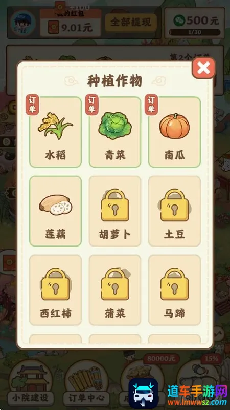 游戏玩法简单,打开游戏查看订单,点击空地种植所需作物,等待成熟收获,完成订单获丰厚奖励,还能升级小院建筑提升效率。它能种植丰富作物,体验真实资源调配,有真实时间流转机制。此外,它真实还原农场经营全貌,有丰富任务与活动,采用治愈系古风画面,每日登录可领资源。在延续经典玩法基础上融入古风元素,可玩性高,还能边玩边领红包赚零花钱,**适合想体验田园生活又想轻松赚钱的玩家**。