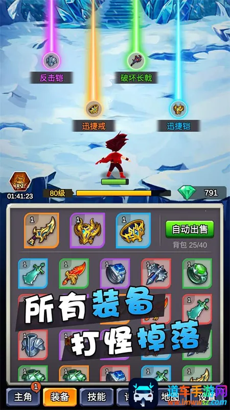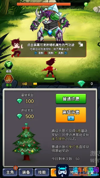 攻略方面,新手可先全点技能一级再加攻速,基础自动攻速最高到20次/秒。装备先凑迅捷套升级快,之后过渡到反击或属性套、破坏套。记得看地图红点换图加经验,装备共10阶对应30张地图。刷钻石可回第一关,每日许愿最多50次。