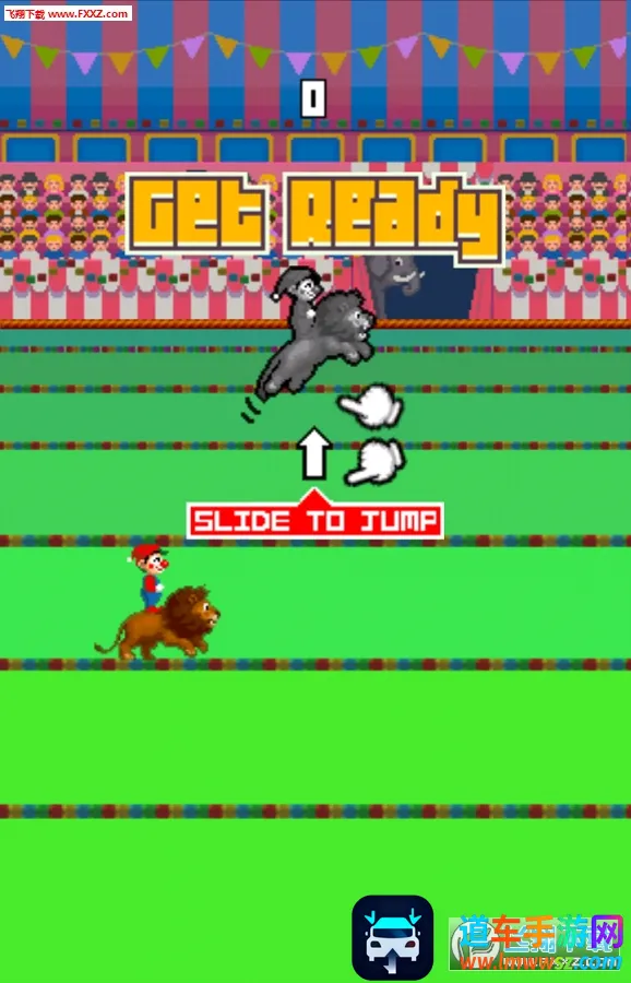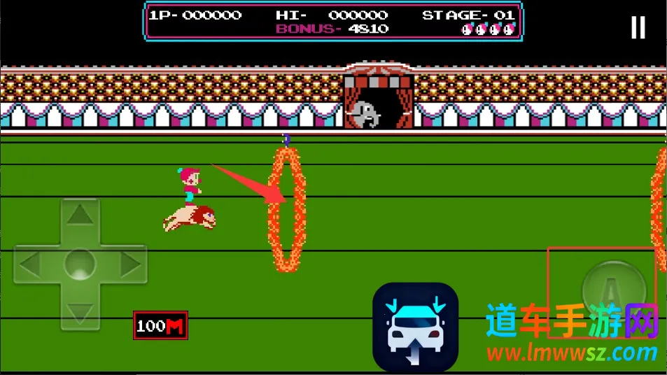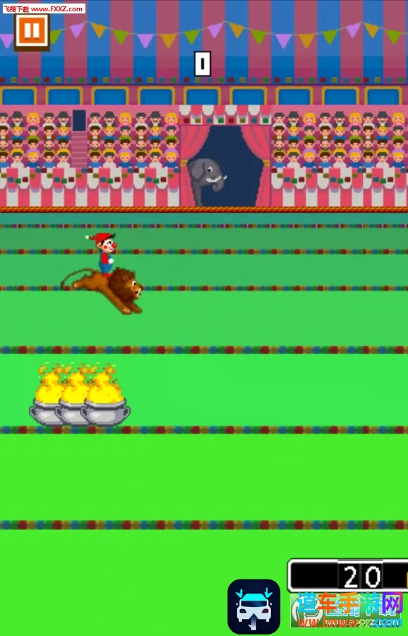 4、当遇到火圈类障碍时,点击跳跃按钮让角色跃过。成功穿过每个火圈都能获得相应分数,累积越多成绩越好。