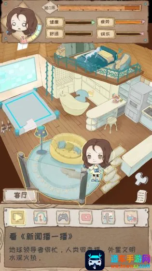 这里完全自由,不用担心钱和资源,尽情享受悠闲时光。通过各种选择来提升健康、疲惫、舒适、娱乐值,这些指标会影响结局。比如选对项目,指标增益,主角状态变好,结局更优。