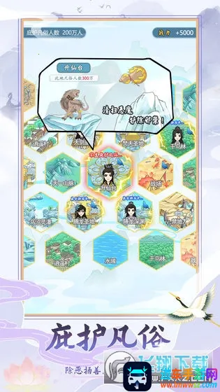 4. 庇护凡俗,探索游历:地图涵盖多样地貌,隐藏丰富宝藏。派遣弟子巡查凡间积累气运,深入绝地解锁稀有功法与特殊事件,在修真与尘世间找到平衡。
