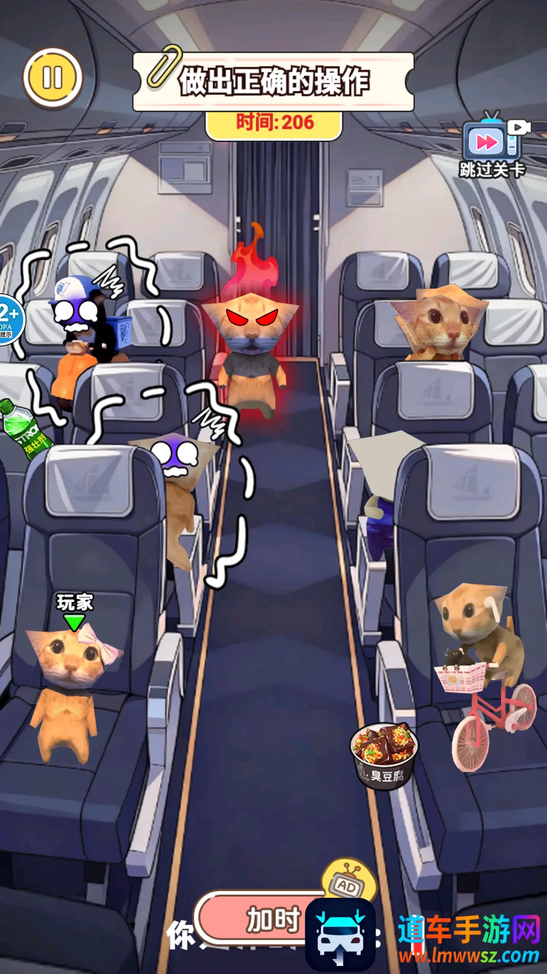 2. 游戏以飞机机舱为核心场景,玩家需灵活利用行李箱餐车等场景道具隐藏自身,躲避邪恶修猫的追捕。