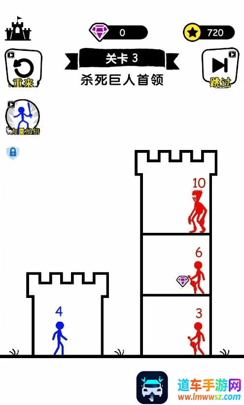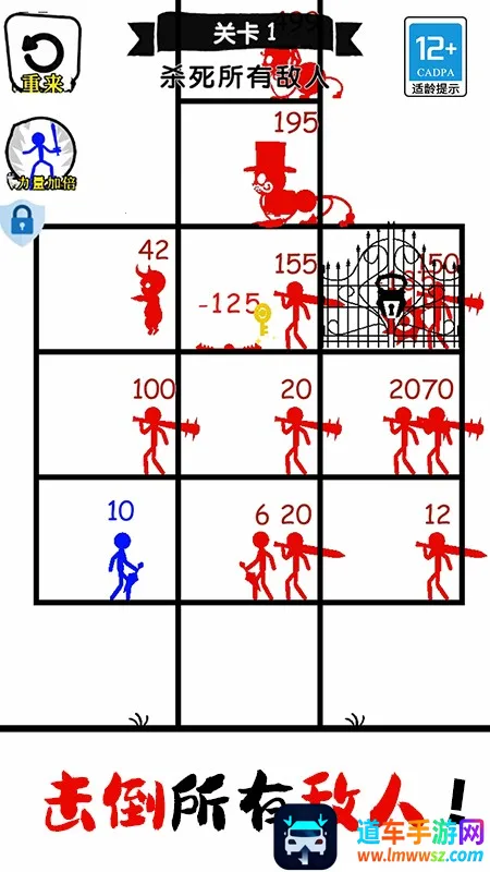游戏中,你需观察场上局势,通过移动火柴人的位置,让它在塔内与不同敌人战斗,打败全场敌人后,火柴人的实力会变强。随着关卡深入,难度不断升级,带来更精彩的挑战。完成爬塔挑战任务,就能收获奖励,升级角色,解锁道具。