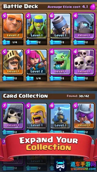 2. 收集升级多样卡牌:可收集皇室战争家族成员、部落冲突军队、法术和防御建筑等卡牌,并进行升级,打造强力卡组。