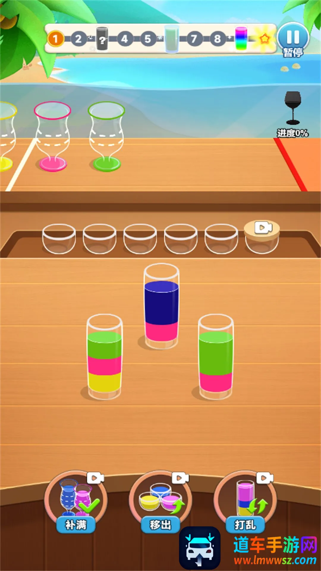 1. 独特关卡设计:关卡众多,杯子数量与颜色组合各不相同,挑战难度循序渐进。