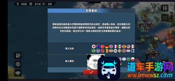 当然也不排除氪佬在这种情况下也可以完成竞速,但是大部分玩家肯定完成不了,而这个事件是如何触发的,我这边娓娓道来,在玩联合国的国家时,在第五回合开始时会进行判定,有50%概率触发该事件,一旦过了第五回合如果没有触发,后续也不会触发,因此竞速的关键就是第五回合能否不触发该事件,如果光靠概率会不会让竞速太麻烦了,因此这里有个技巧可以不触发这个决裂事件,在第五回合要开始的时候,就像这样,然后别点这个√,