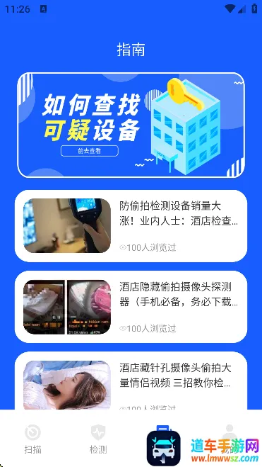 很多人住酒店时都担心被偷拍,“酒店防偷拍助手app”就能解决这个大问题。它功能超强大,有便捷的检测方式,像磁力、蓝牙等,能帮你快速搜索出附近的红外线及针孔摄像头。操作特别简单,进入页面点击申请授权,允许获取位置权限,然后点开始检测就行,每个功能都清晰显示,直接点击就能用。它依托强大数据挖掘技术,能快速分析局域网中的设备,通过搜索设备网络及硬件特征,全方位保障你的安全。这软件界面简洁明了,还有详细使用说明。有了它,出门在外住酒店就安心多了,能放心沐浴入睡。而且它不仅能防偷拍,还有防盗听、防狼手电等超多实用小功能。它真的很靠谱,能精准排查身边危险信号,定位设备位置,为你的隐私安全保驾护航,大家可以放心下载使用。