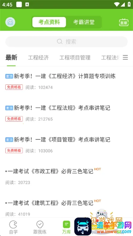 万题库是一款超棒的职业考试备考软件。它涵盖金融、财会、工程、医学等各类职业考试。功能超强大,有海量免费题库资料,能随时刷题;专业老师7×12小时轮循在线直播,可随时加入学习,还能实时发消息互动;支持添加关注,不错过直播课;全国统一大模考,还原官方考纲标准,检测学习情况;能自定义学习计划。优势明显,直播课程讲义可下载,海量学习资料免费,互动讲堂天天有直播,还能根据考试情况生成报告,随时查看考点分析。使用方便,登录应用设置好考试类型和地区,就能轻松进入题库练习、观看直播、参与章节课程练习、报名模考。不管你是想自考还是备考其他职业资格证,万题库都能帮你高效学习,轻松应对考试,强烈推荐!
