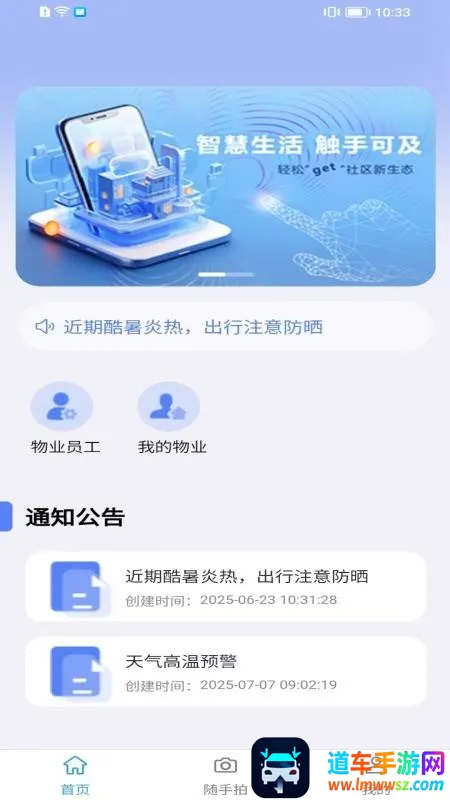 港城智慧物业最新手机版提供一站式物业管理服务,涵盖物业员工管理、通知公告推送、随手拍反馈等功能,界面简约,操作简单,能智慧化管理物业工作,提高效率,让用户轻松掌握物业动态,便捷处理各项事务。