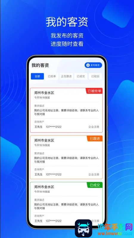 万资企客最新手机版是全国企业工商税务服务平台软件,提供专业企服数据。能一键发送工商或税务需求,实时发布客资,支持自由接单、进度查询等。有丰富客资与商机,高效对接,助您轻松跟进成交订单。