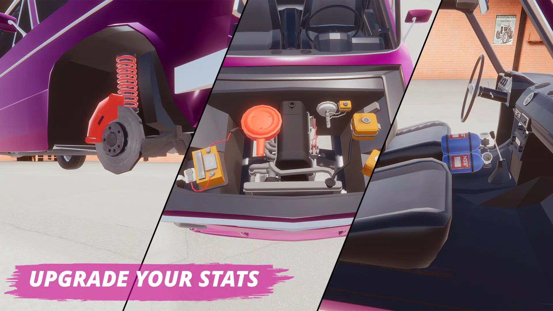 1、深度汽车定制:能从发动机到车身,逐个部件组装梦想之车,还可安装和升级各类部件,调整悬架、外倾角、偏移和轮胎等,每个部分都影响实际性能。
