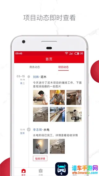 2. 动态随时查看:支持随时查看商务动态以及项目动态,能快速看到验收详情、户主信息等,还可浏览日志记录,方便掌握装修办公进展。