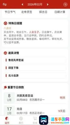1、三历同显界面独具特色,道历、公历、农历清晰对照,能兼顾传统习俗与现代日程安排,让时间维度一目了然。