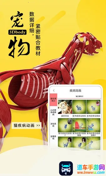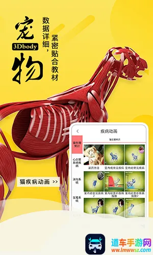 3dbody宠物app免费下载优势显著。**免费下载节省成本**,能让兽医等相关人员轻松获取这款专业学习软件。其内容详实丰富,有300多个以上视频和动画,海量真实案例,助您深刻了解宠物。可任意角度观察数千个结构,还能放大缩小平移等,操作方便。能层层剥离观察解剖结构,学习猫狗疾病学等知识。全三维展示宠物各系统,功能强大,数据详细紧密贴合教材,动画清晰直观分类明确,为宠物知识学习提供极大便利。