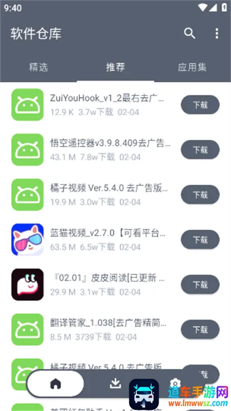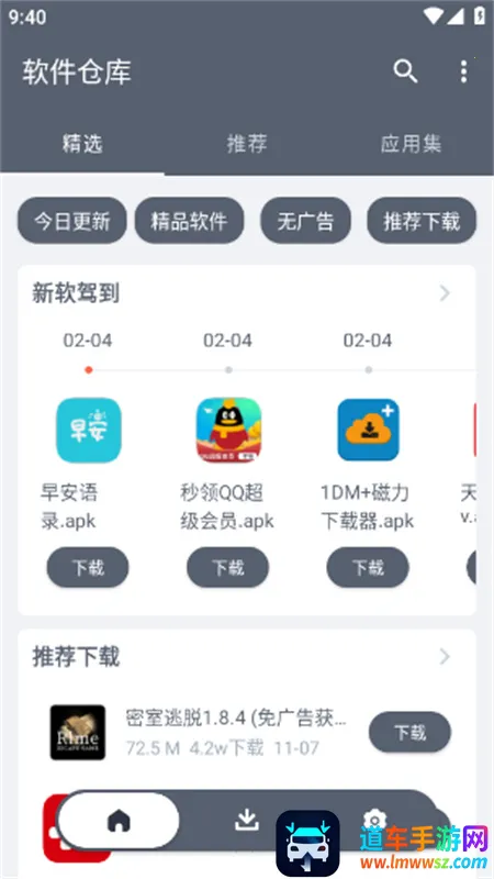 使用起来很方便,下载本站提供的软件仓库App,安装后打开,首页有精选推荐、应用集等板块。精选板块集合今日更新无广告和精品应用;推荐板块全是精品软件,各类应用都有;应用集板块包含丰富应用合集,点开就能下载。还能直接在搜索框输入关键词搜索。