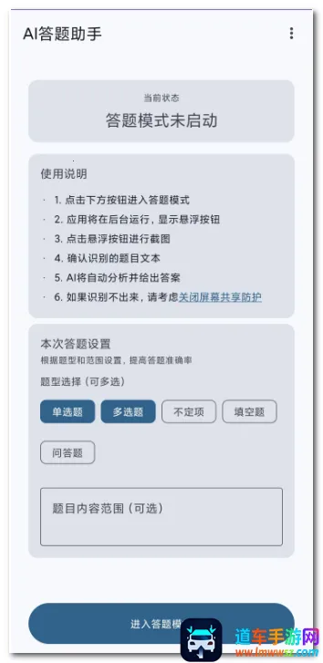 AI答题助手2026官方最新版本优势显著。它能快速精准识别题目,一键截取屏幕并自动聚焦题目区域,中英文识别且可编辑校正。答题迅速,依据题型生成解析并自动复制答案。采用悬浮窗操作,无需切换应用。还支持本地可控,可自定义APIKey,随时启停网络请求。无论是练习查缺补漏还是自测,都能高效助力,为用户带来便捷、准确的答题体验,满足多种答题需求。
