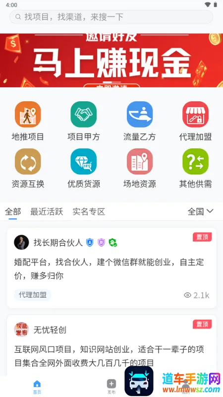 4、提供多种发布类型,如地推项目、项目甲方、流量乙方、代理加盟、资源互换等,满足多样需求。