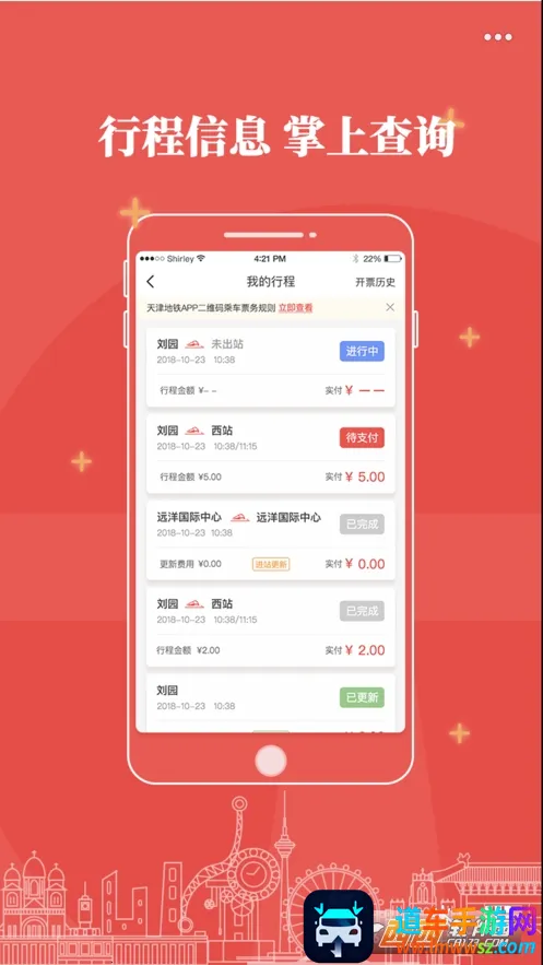 天津地铁APP是出行好帮手。它能查询天津地铁各线路信息,包括起点终点、首末班车时间、票价等,还能查换乘路线及时间。实时地铁运行状态查询功能,可让你知晓各个站点列车到达时间、运行状态和延误情况。站点周边服务查询,能帮你找到车站附近餐饮、住宿、购物等设施。线路规划功能,依据出行需求选定出发站和目的地,获取最优换乘路线和时间。账户管理及购票超方便,能绑定天津通卡,随时查余额、买乘车券及充值。还有实时消息推送,接收列车延误、站点封闭等信息,语音导航帮你找乘车口和出站口。另外,天津地铁拥挤度查询app手机版新开发了拥挤度查询功能,能让你随时了解车厢拥挤程度,选择不拥挤的车厢,让出行更便利。