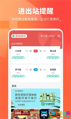 用户登录天津地铁APP,实名绑卡后生成专属乘车码,对准闸机二维码扫码口轻轻一扫,就能轻松进出站,而且是先乘车后付费。软件贴心的地铁信息查询功能,让乘客享受便捷的掌上查询服务。其拥有多种实用功能,比如能查询地铁线路包括起点终点首末班车时间票价等信息,还能查询换乘路线及时间;可实时查询列车到达时间、运行状态和延误情况;能查询站点周边服务设施;可根据出行需求规划最优换乘路线和时间;还能在应用内绑定天津通卡,查询卡内余额、购买乘车券并在线充值;接收实时消息推送,包括列车延误、站点封闭等信息;具备语音导航功能帮助找到乘车口和出站口。