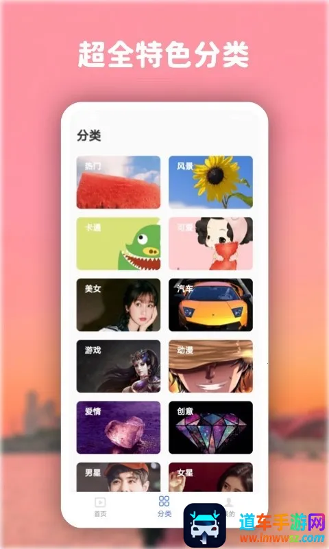 4. **种类丰富**:涵盖4K高清壁纸、炫酷视频动态壁纸、热门风景、汽车、卡通、可爱游戏动漫等多样类型,还有情感语录、心灵鸡汤、可爱萌宠、自然风光等各种题材,满足你的多样需求。