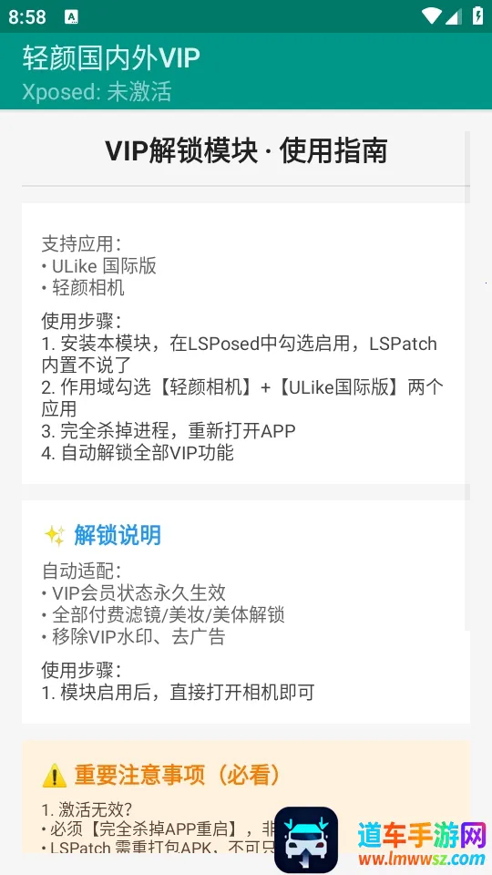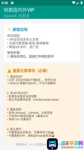 轻颜国内外 VIP 是轻颜相机模块工具,能免费解锁国内外版 VIP。适配会员状态永久生效,付费滤镜等全解锁,移除水印去广告。双版兼容,搭配 LSPosed 框架使用,操作简单易上手,按步骤设置即可生效。