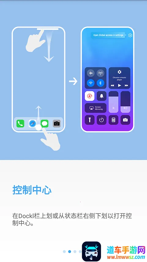 在dockl栏上划或从状态栏右侧下划以打开控制中心。