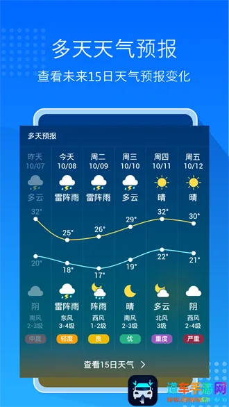 2. 提供15天天气预报,包括风向、温度、空气质量等信息,还有未来40天的天气预报、分钟级降雨预报等,天气情况尽在掌握。