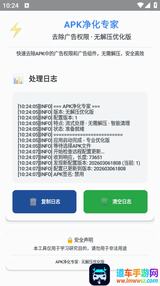 去除广告权限2026最新版本又名apk净化专家优化版,能快速去除apk广告权限和组件,安全高效不占资源,适配安卓设备。处理时先获文件权限,选apk文件,自动处理,处理后可用mt管理器优化,仅针对无需广告获奖励应用,有常见问题解答。