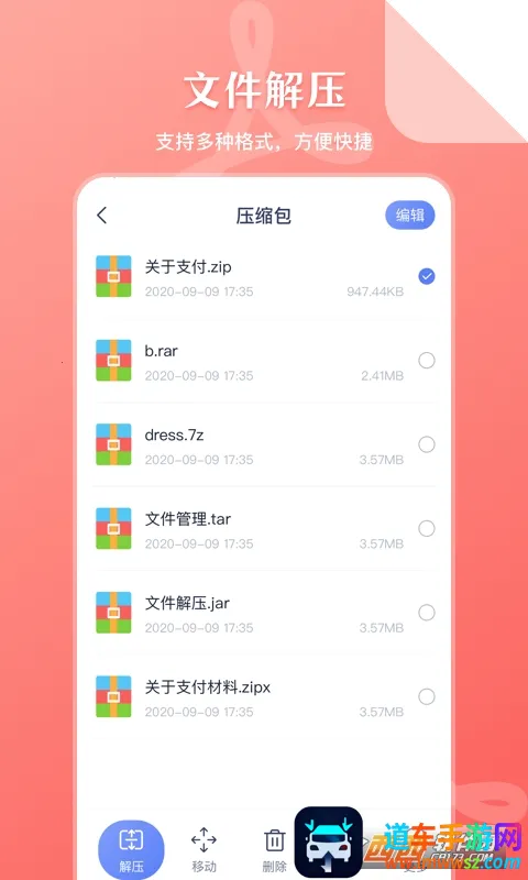 2. 支持多种格式的压缩和解压缩,像zip、7z、rar等常用的几十种格式压缩包都能一键解压。