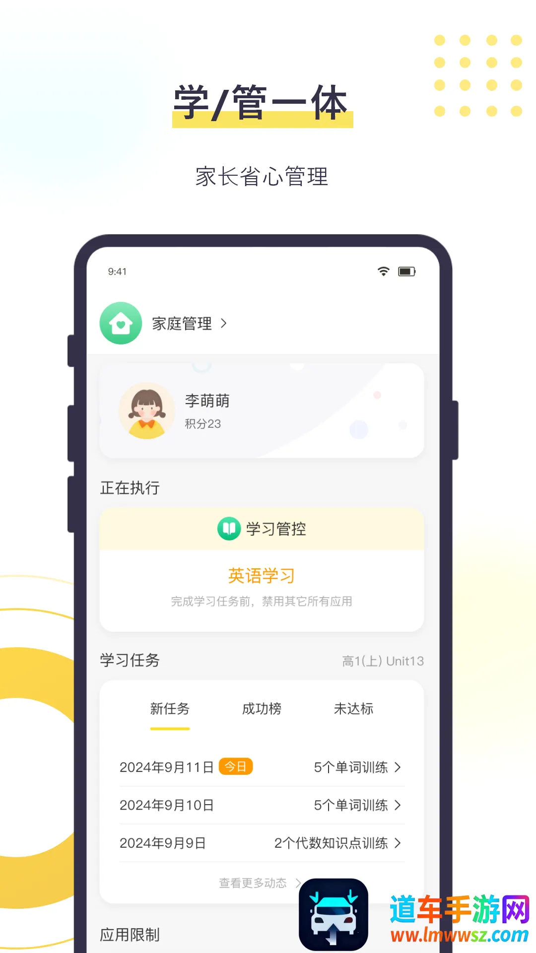 想让孩子养成自律好习惯,数育帮孩子端是个不错的选择。它采用积分制度,能帮家长快速建立合理奖惩规范和家庭行为,助孩子形成自律管理意识。以日常打卡记录积分,家长可随时查看孩子设备使用详情数据,针对不同沉迷程度,系统会引导解决沉迷问题。孩子能看到家长设定的任务目标,完成获积分,快速形成自律意识。软件还支持老师1对1辅导,缓解家长辅导压力,助力孩子学习。功能上能自动统计设备使用情况、查看待办事项。特色是手机上就能享受便捷辅导,省心省事。亮点包括培养契约精神、查看孩子手机使用情况、可临时锁屏、强化规则意识等。家长下载数育帮家长绑定管控插件,就能远程管理孩子手机啦。
